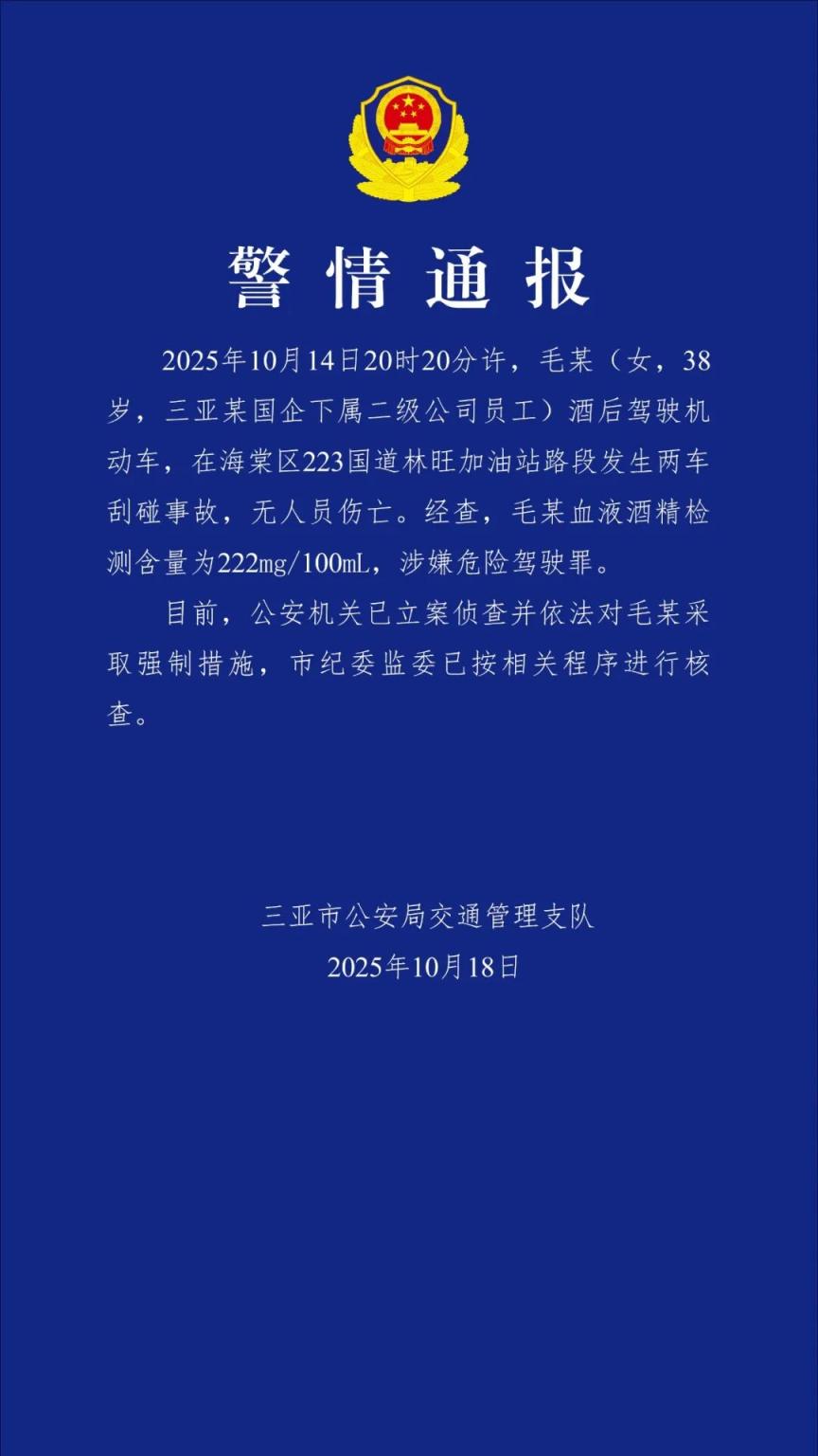 10月14日20时20分许,毛某(女,38岁,三亚某国企下属二级公司员工)酒后驾驶机动车,在海棠区223国道林旺加油站路段发生两车刮碰事故,无人员伤亡。