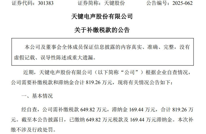 对于此次天健电声主动揭开自己的“伤疤”,进行自查补税,其答案就藏在公告的细节里——“此次补缴不涉及行政处罚” 。